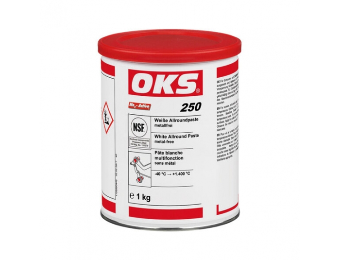OKS 250 là kem lắp ráp màu trắng, không chứa kim loại, lý tưởng cho việc bôi trơn các bề mặt trượt chịu tải cao, đặc biệt ở tốc độ trượt thấp hoặc chuyển động dao động. Sản phẩm này đặc biệt phù hợp cho các mối ghép bu lông, kết nối bayonet, và các bề mặt chịu nhiệt độ cao trong động cơ đốt trong và tuabin.
